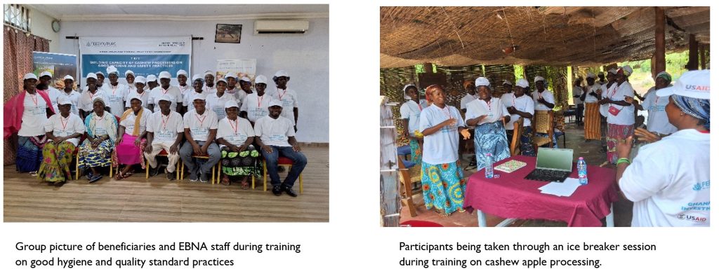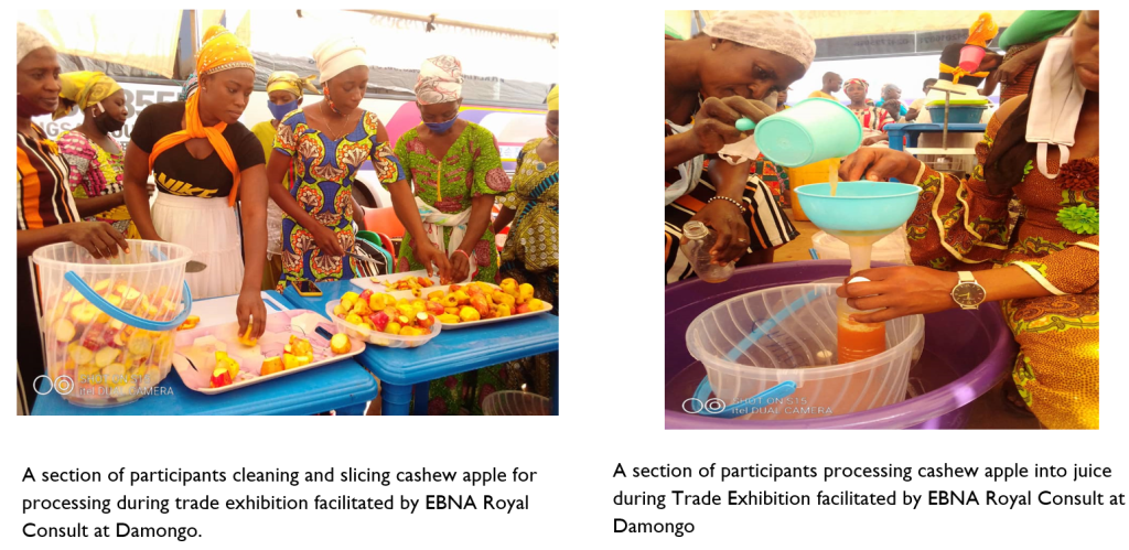 3. Implementation of Market-Driven Cashew Apple Processing (MD-CAP) grant activity: Withfunding support from USAID fund Ghana Trade and Investment (GTI) Activity, EBNA Royal Consult implemented a grant activity dubbed “Market-Driven Cashew Apple Processing” (MD-CAP) in the West Gonja District of the Savannah Region of Ghana. Thirty (30) cashew apple (fruit) women processers are being supported with technical training and support in cashew apple value addition (i.e. juice, jam and khebab), business management training, good hygiene and provision of simple processing equipment and logistics to up-scale their cashew apple processing businesses.
