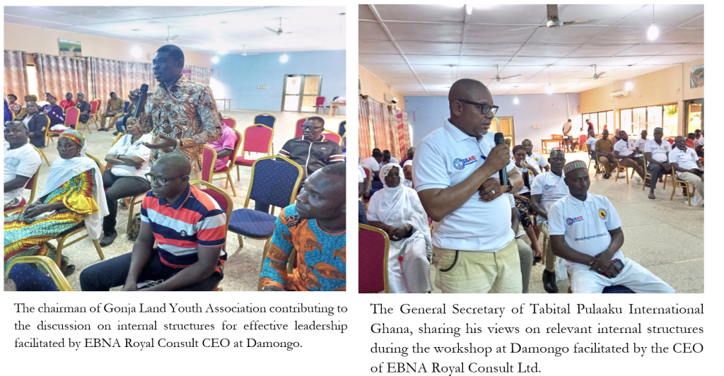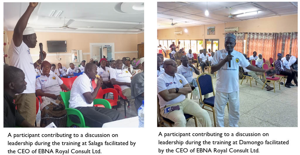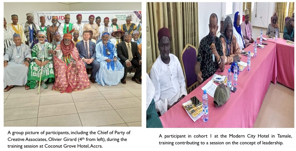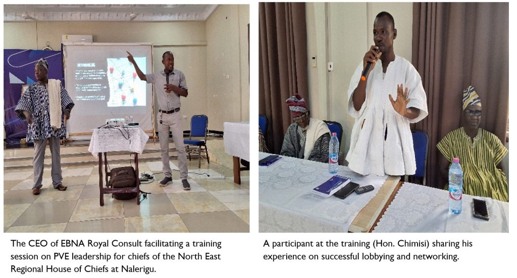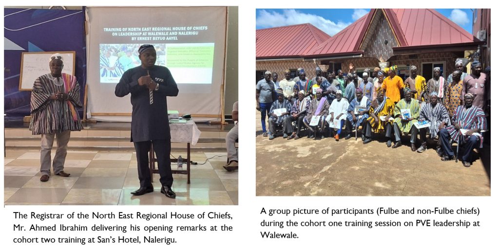 1. Development of Prevention of Violent Extremism (PVE) leadership training manual and training on leadership: Contracted by Creative Associates under the USAID OTI/LRI project to conduct training on PVE leadership selected chiefs and Fulbe leaders of the North East Regional House of Chiefs at Walewale and Nalerigu (October, 2024).