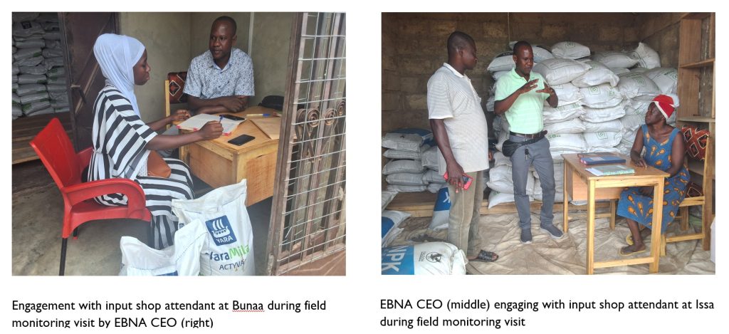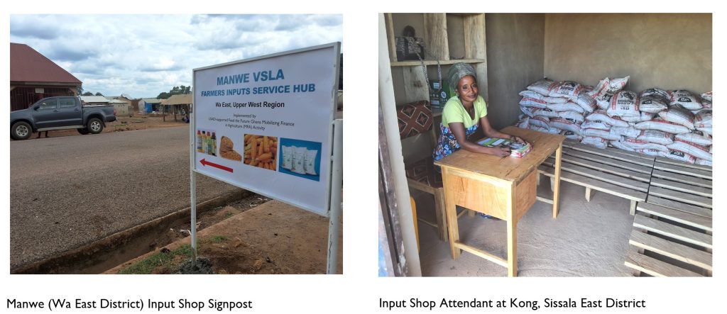 2. Improved Productivity through Smallholder Access to Fertilizer and other Agriculture inputs using Farmers Inputs Service Hubs (FISH): With funding support from USAID Mobilizing Finance in Agriculture (MFA), EBNA Royal Consult facilitated the set-up of ten (10) Farmers Input Supply Hubs (FISH) using vibrant Village Savings and Loans Associations (VSLAs) to increase smallholder farmers access to agriculture input (chemicals and fertilizer) and increase farm yields and household incomes in ten (10) communities of the Wa East, Nadowli/Kaleo, Sissala East, Sissala West and Daffiama Busia Issa Districts of the Upper West Region of Ghana.