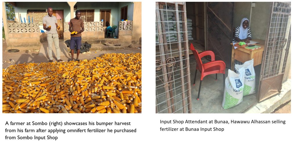 - Successfully negotiated with five (5) large-scale input dealers (fertilizer and chemicals) to supply 1,217 bags of assorted fertilizer (valued at GHC452410) and 411 litres of assorted chemicals (valued at GHc22,534) to about 499 smallholder farmers using the 10 community input shops as the vehicle to enhance farmers access to these critical inputs at the community level.
