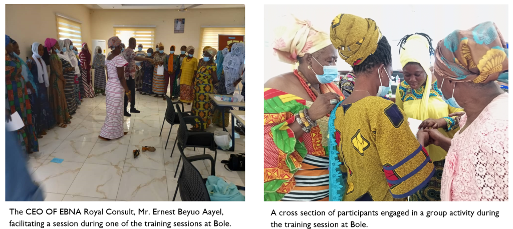 3. Development of Prevention of Violent Extremism (PVE) leadership training manual and training on leadership: The CEO of EBNA Royal Consult was contracted by Creative Associates International under the USAID Office of Transition Initiatives (OTI) Littorals Regional Initiative (LRI) to develop training manuals and deliver training on PVE leadership for members of Savannah Region Queen Mothers Association (February, 2022).