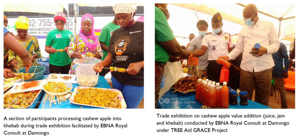 6. Trade exhibition on cashew apple value addition: Conducted trade exhibition on cashew apple value addition with focus on juice, jam and ‘khebab’ involving women cashew farmers under the Tree Aid GRACE project (December 2020) at Damongo in the Savannah Region.