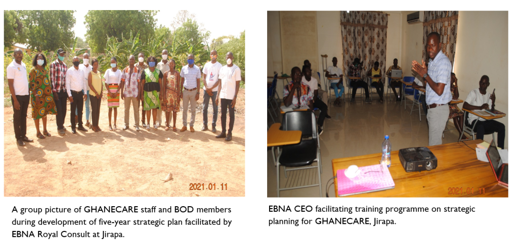 7. Training on organizational policies, fund-raising and development of five-year strategic plan: Conducted training for staff and BOD members of GHANECARE on organizational policies, fund-raising and facilitated the development of five-year strategic plan for the organization (January 2021).