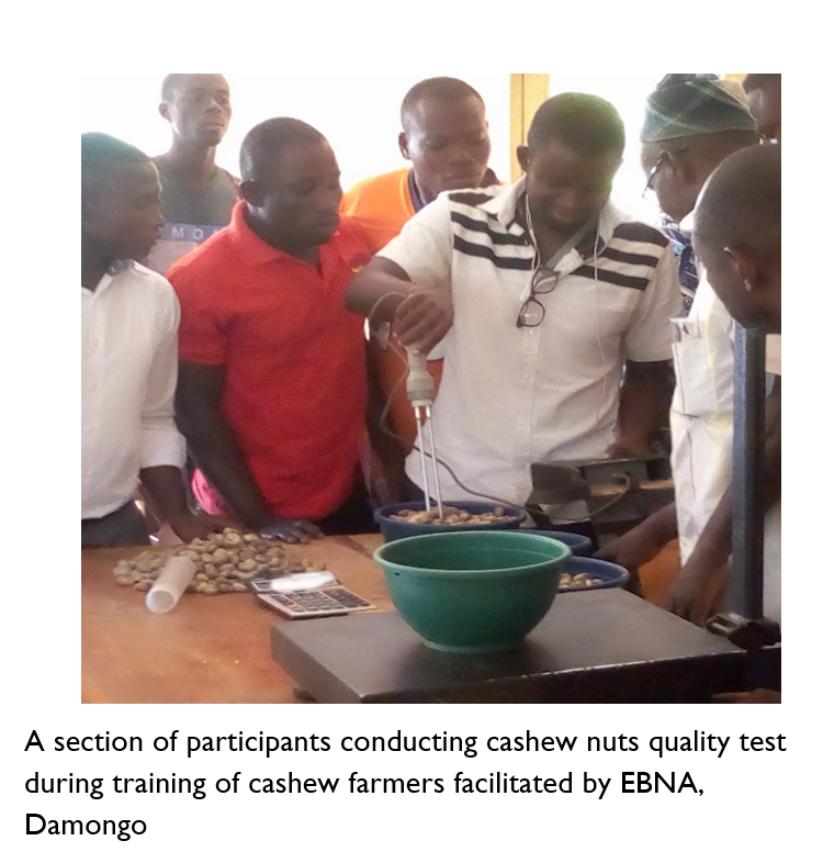 10. Training on cashew quality nuts (moisture content, nut count, kernel out-turn ratio and defective rate): Contracted by NORTHCODE Ghana to build the capacity of selected cashew lead farmers on quality cashew nuts (moisture content, nut count, kernel out-turn ratio & defective rate) at Damongo in the Savannah Region (December 2019).